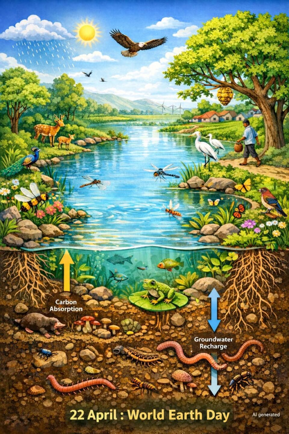 जलसाठ्याचा पुनर्विकास आवश्यक -जागतिक वसुंधरा दिन—पर्यावरणीय संकल्पाचा मुहूर्त—या विषयाची सुरुवात करताना एक साधी पण अत्यंत प्रभावी जाणीव लक्षात घ्यायला हवी, ती म्हणजे पर्यावरणाचा ऱ्हास थांबविणे. एक छोटेसे उदाहरण घेऊया, तुमच्या अवतीभवतीच्या एखाद्या तलावाचे निरीक्षण करा.कल्पना करा की तो कोरडा पडला.त्याच्या कोरडेपणामुळे कशा कशावर परिणाम होतो याचा विचार जरी केला तर पर्यावरणाचा ऱ्हासाचे किती वाईट परिणाम होतात, हे लक्षात येते. उदाहरणार्थ कोरडा पडणारा एक तलाव वाचविणे हे केवळ जलस्रोत पुनर्जीवित करणे नसून संपूर्ण परिसंस्थेचा पुनर्जन्म घडविण्याचा शास्त्रीय प्रयत्न ठरतो. पाणी हे जीवनाचे मूलतत्त्व असल्याने जलसाठ्यांचे संगोपन केल्यास भूजल पातळी पुनर्भरण (ग्राऊंडवाटर रिचार्ज) होते, जलचक्र संतुलित राहते आणि परिसरातील सूक्ष्म हवामान (मायक्रोक्लायमेट) स्थिर होते. तलावाभोवती ओलावा वाढल्याने वनस्पती, पक्षी, कीटक व सूक्ष्मजीव यांची जैवविविधता नैसर्गिकरीत्या वाढते, ज्यामुळे अन्नसाखळी बळकट होते आणि परिसंस्थेचे संतुलन राखले जाते. अशा जलाशयांमुळे कार्बन शोषण (कार्बन सिक्वेस्ट्रेशन) सुलभ होऊन हवामान बदलाच्या परिणामांना आळा बसतो, तसेच मृदेची धूप कमी होऊन जमिनीची सुपिकता टिकून राहते. परिणामी, स्थानिक समुदायाला शाश्वत उपजीविका मिळून शाश्वत विकास साध्य होतो. पृथ्वीचे वैशिष्ट्य म्हणजे पंचमहाभूतांचे—पृथ्वी, जल, वायू, अग्नी आणि आकाश—समतोल सहअस्तित्व; त्यामुळे या घटकांचे संरक्षण म्हणजेच पर्यावरण संवर्धनाची मूळ संकल्पना होय. म्हणूनच एक तलाव वाचविणे म्हणजे केवळ पाणी साठवणे नव्हे, तर संपूर्ण वसुंधरेचे संतुलन जपण्याचा आणि भविष्यातील जीवन सुरक्षित ठेवण्याचा जागतिक स्तरावरील पर्यावरणीय संकल्पच होय.