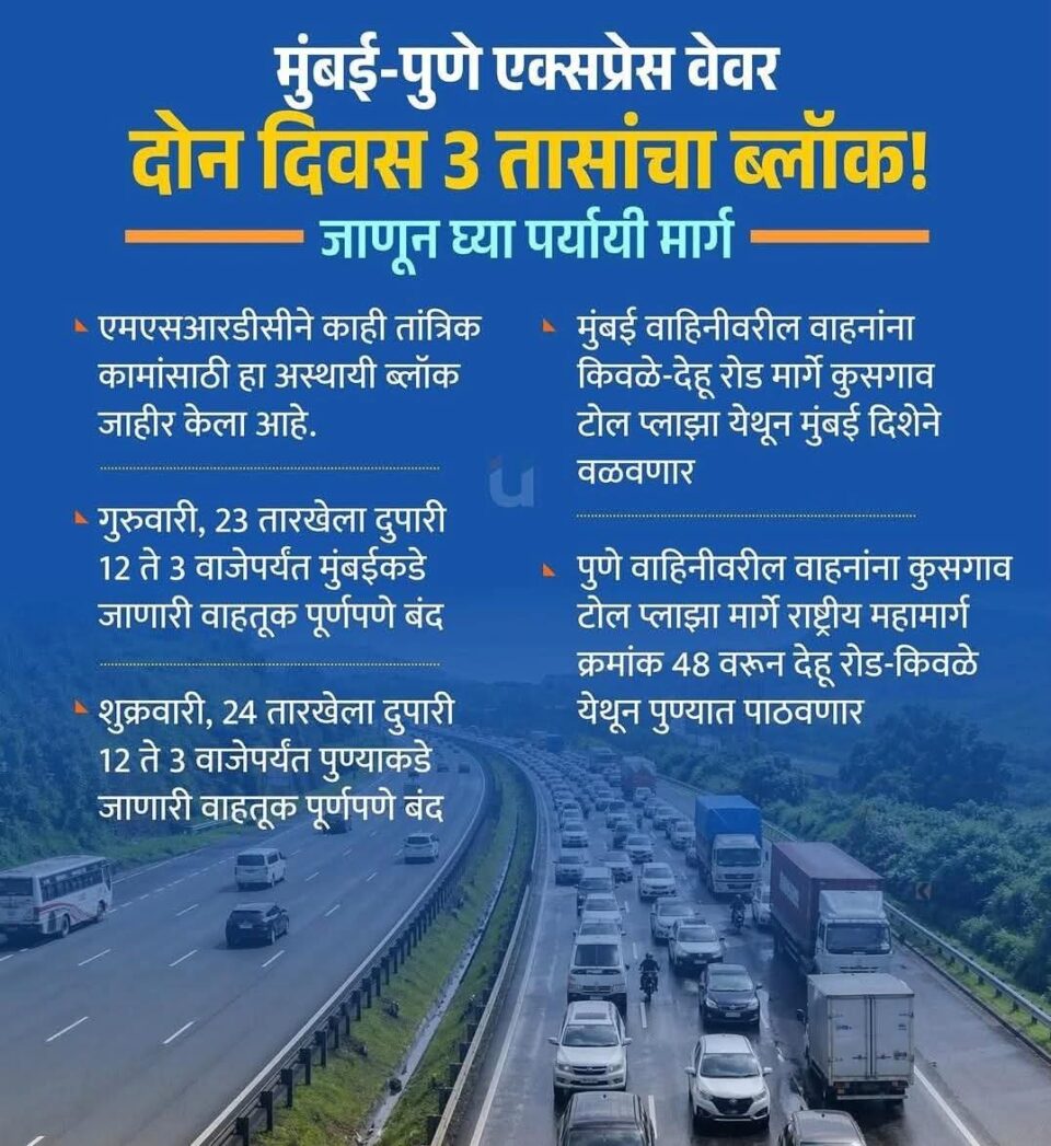 राज्य प्रतिनिधी- मुंबई पुणे एक्सप्रेस वे तीन तासाचा दोन दिवस ब्लॉग असणार आहे याकरता पर्यायी मार्ग जाणून घ्यावे