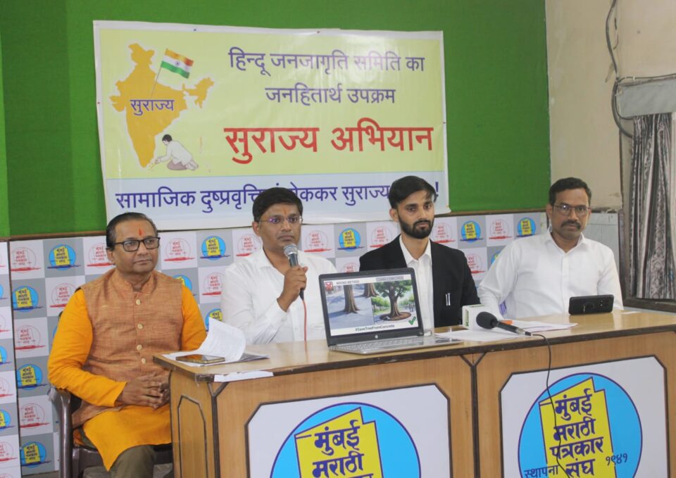 *मुंबई* प्रतिनिधी- रस्ते विकास आणि सौंदर्यीकरणाच्या नावाखाली प्रशासनाकडूनच शहरांचे ‘फुफ्फुस’ असलेल्या वृक्षांचा गळा घोटला जात असल्याचे भीषण वास्तव ‘सुराज्य अभियाना’च्या राज्यव्यापी पाहणीत समोर आले आहे. मुंबई महानगरपालिकेने १ एप्रिल २०२६ पासून ‘वृक्ष संजीवनी’ अभियान सुरू करून झाडांभोवतीचे काँक्रीट काढण्याचा उपक्रम हाती घेतला असला, तरी सुराज्य अभियानाने अशा मोहिमेच्या मूळ हेतूवरच गंभीर प्रश्न उपस्थित केले आहेत. “झाडांभोवतीचे काँक्रीट काढणे हा केवळ एक महिन्याचा ‘इव्हेंट’ नसावा. मुळात अशी मोहीम राबवण्याची वेळच का येते? रस्ते बांधताना ‘नॅशनल ग्रीन ट्रिब्युनल’च्या आदेशांचे सरळसरळ उल्लंघन करून झाडांच्या बुंध्यापर्यंत काँक्रीट ओतले जाणे, हीच सर्वांत मोठी चूक नाही का? ‘काँक्रीट काढा’ अभियान राबवण्याऐवजी, हे उल्लंघन करणाऱ्या दोषींवर NGT Act 2010 च्या कलम २६ अन्वये ‘फौजदारी कारवाई’ करण्याचे अभियान का नाही ?, असा रोखठोक प्रश्न *’सुराज्य अभियान’चे महाराष्ट्र राज्य समन्वयक श्री. अभिषेक मुरुकटे यांनी आज ‘जागतिक वसुंधरा दिना’निमित्त मुंबई मराठी पत्रकार संघ येथे झालेल्या पत्रकार परिषदेत उपस्थित केला*. यावेळी हिंदू जनजागृती समितीचे प्रवक्ता डॉ.उदय धुरी, अधिवक्ता प्रथमेश गायकवाड आणि अधिवक्ता गणेश कोळी उपस्थित होते.
