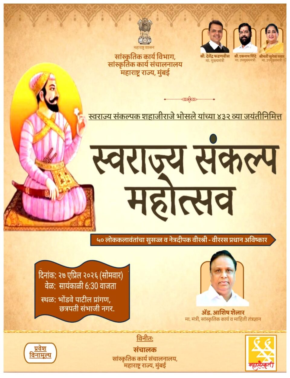 छत्रपती संभाजीनगर, प्रतिनिधी- महाराष्ट्र शासनाच्या सांस्कृतिक कार्य संचालनालय तर्फे स्वराज्य संकल्पक शहाजीराजे भोसले यांच्या ४३२ व्या जयंतीनिमित्त ‘स्वराज्य संकल्प महोत्सवाचे भव्य आयोजन करण्यात आले आहे. या महोत्सवाच्या माध्यमातून स्वराज्याच्या संकल्पनेचा इतिहास, परंपरा आणि प्रेरणादायी विचार लोककलेच्या माध्यमातून सादर केले जाणार आहेत. हा कार्यक्रम सोमवार, दि. २७ एप्रिल २०२६ रोजी भोंडवे पाटील प्रांगण, छत्रपती संभाजीनगर येथे सायं. साडेसहा वा.आयोजित करण्यात आला आहे.