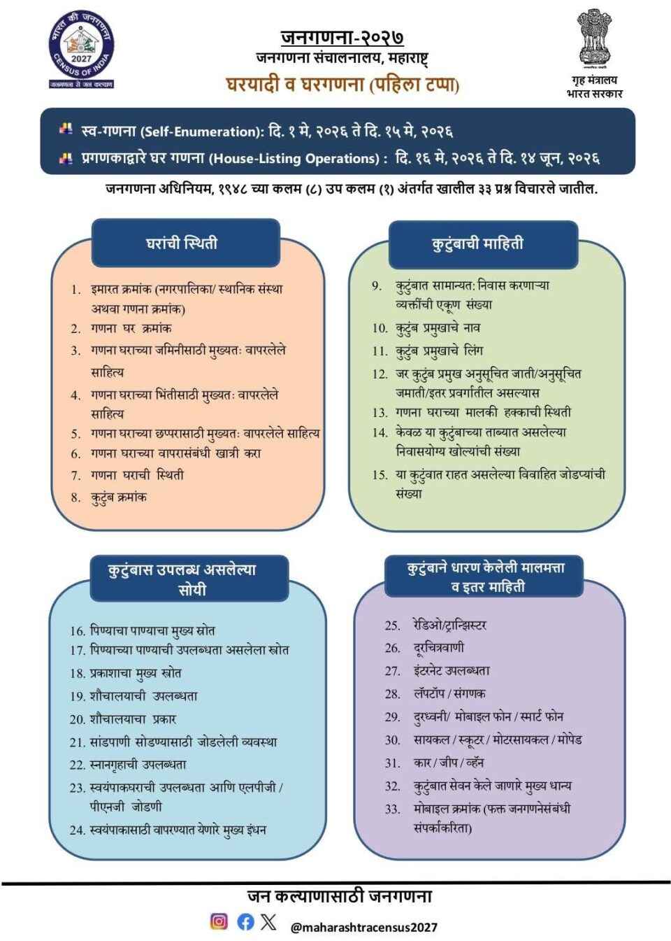 नवी मुंबई प्रतिनिधी-जनगणना २०२७: घरयादी व घरगणनेचा पहिला टप्पा! 🇮🇳महाराष्ट्रात १ मे २०२६ पासून जनगणनेची प्रक्रिया सुरू होत आहे. या प्रक्रियेत घराची स्थिती, कुटुंबाची माहिती, उपलब्ध सुविधा आणि मालमत्तेशी संबंधित एकूण ३३ प्रश्न विचारले जातील. 📋